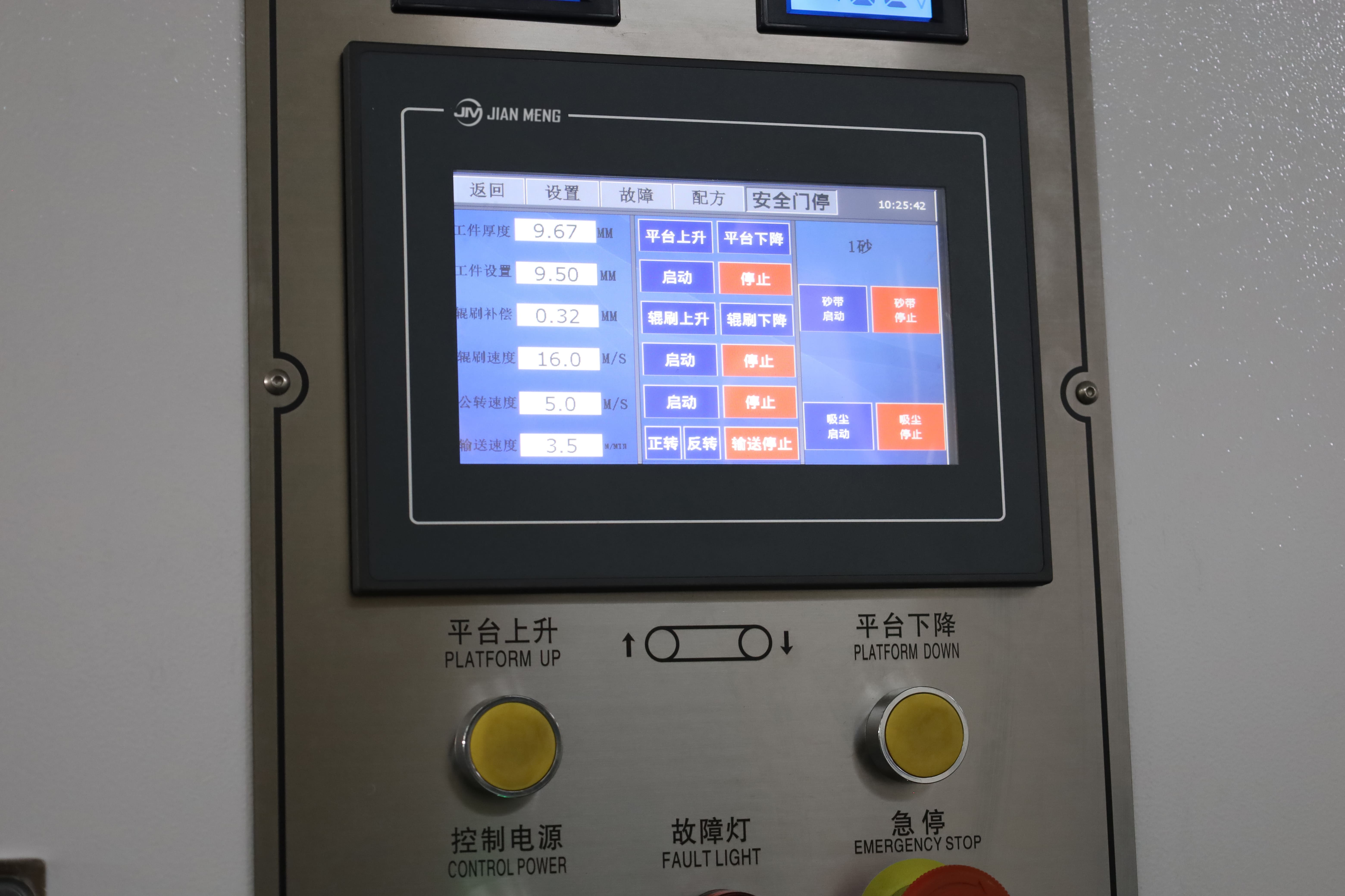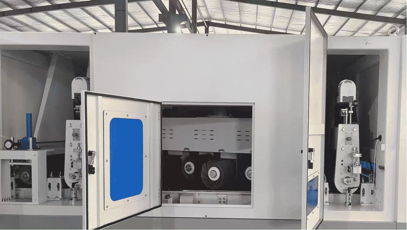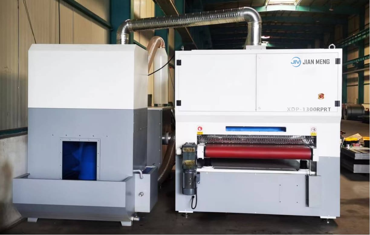 Cấu trúc bên trong của 1000RPRT bao gồm một bộ đai mài mòn + tám chổi lăn + một bộ đai mài mòn + một con lăn đánh bóng, tạo thành hệ thống xử lý bốn giai đoạn. Đai mài mòn thứ nhất được sử dụng để loại bỏ ban đầu các gờ khỏi bề mặt phôi; giai đoạn thứ hai với tám bàn chải con lăn thực hiện xử lý chải, đảm bảo mài nhẵn triệt để mà không làm hỏng bề mặt; bộ đai mài mòn thứ hai giúp mài mịn hơn nữa để cải thiện độ phẳng bề mặt; và cuối cùng, con lăn đánh bóng thực hiện việc đánh bóng chính xác, làm cho bề mặt mịn màng, đồng đều và tinh tế về mặt thị giác. Với cấu trúc được thiết kế tốt, Máy hoàn thiện kim loại cho phép xử lý bề mặt hiệu quả, ổn định và liên tục.